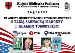 Miejska Biblioteka Publiczna w Dąbrowie Tarnowskiej zaprasza na amerykańskie popołudnie literacko-muzyczne z Elizą Sarnacką-Mahoney i Adamem Tomczykiem, które odbędzie się 04.07.2024 r. (czwartek) o godz. 17:00 w Sali Audytoryjnej MBP.