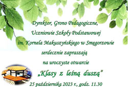 Szkoła Podstawowa im. Kornela Makuszyńskiego w Smęgorzowie serdecznie zaprasza na uroczyste otwarcie „Klasy z leśną duszą”, która powstała przy wsparciu finansowym Lasów Państwowych.