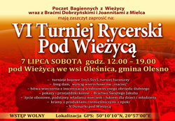 Poczet Bagiennych z Wieżycy wraz z Braćmi Dobrzyńskimi i Joannitami z Mielca mają zaszczyt zaprosić na VI TURNIEJ RYCERSKI POD WIEŻYCĄ, 7 LIPCA SOBOTA godz. 12.00 – 19.00 pod Wieżycą we wsi Oleśnica, gmina Olesno.