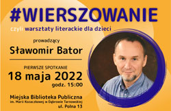 Warsztaty literackie pt. #WIERSZOWANIE prowadzone przez Sławomira Batora odbędą się w trzech terminach: 18, 24 i 31 maja w godzinach 15:00-17:00 (o ewentualnej zmianie terminów zgłoszeni uczestnicy informowani będą bezpośrednio).