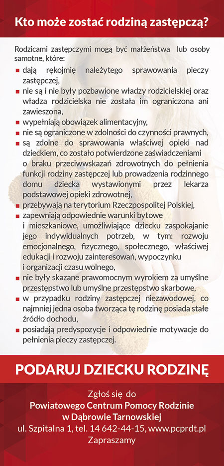 W przypadku gdy dzieci nie mają zapewnionej prawidłowej opieki ze strony rodziców są one objęte pieczą zastępczą instytucjonalną lub rodzinną. Niewątpliwie dla dziecka najlepszym miejscem do rozwoju i poczucia bezpieczeństwa jest rodzina, dlatego Powiatowe Centrum Pomocy Rodzinie w Dąbrowie Tarnowskiej poszukuje kandydatów do pełnienia funkcji rodziny zastępczej.
