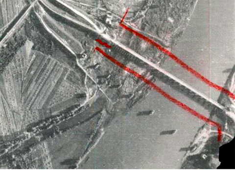Most w Szczucinie odbudowany przez Niemców. Zdjęcie lotnicze z 1944 r. [fotopolska.eu]