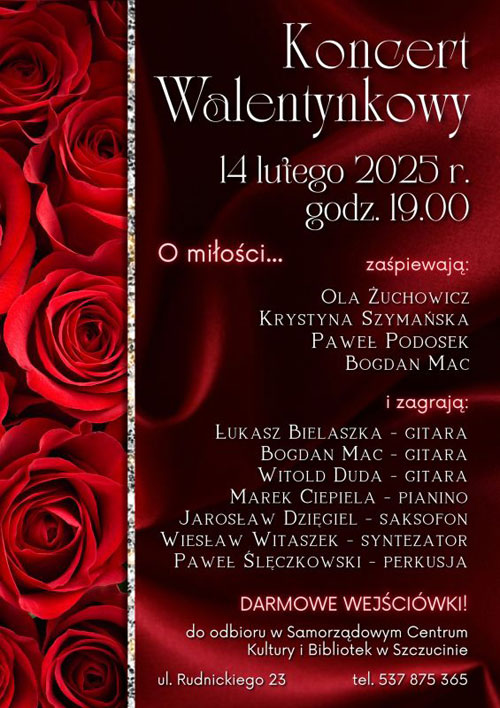 Wstęp na koncert jest bezpłatny! Darmowe wejściówki można odbierać w Samorządowym Centrum Kultury i Bibliotek w Szczucinie. To doskonała okazja, aby spędzić walentynkowy wieczór w gronie bliskich osób, ciesząc się wyjątkową muzyką i artystycznymi doznaniami.