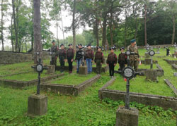 Następnie udaliśmy się w stronę Łowczówka, po czym korzystając z zaproszenia wójta gminy Pleśna Józefa Knapika, odbyliśmy spotkanie w Urzędzie Gminy. Tutaj pan wójt zaprezentował nam „Przewodnik historyczny po cmentarzach I wojny światowej”, po czym wspólnie udaliśmy się na cmentarz legionistów w Łowczówku. Bój pod Łowczówkiem był najcięższym pod względem wysiłku, poniesionych strat i zadań, jakie oddziały Piłsudskiego prowadziły w ciągu 1914 roku.