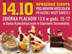Po każdej Mszy św. na placu przed Kościołem NMP Szkaplerznej (nowy kościół) wszyscy chętni będą mogli zakupić ciasta oraz przetwory przekazane na ten cel przez ludzi dobrej woli.