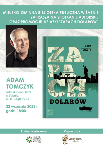 Miejsko-Gminna Biblioteka Publiczna w Żabnie zaprasza na spotkanie z Adamem Tomczykiem oraz promocję jego najnowszej książki „Zapach dolarów”. Spotkanie odbędzie się 22 września o godz. 18:00 w Sali klubowej GCK w Żabnie (ul. W. Jagiełły 16).