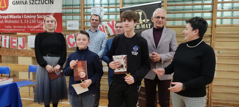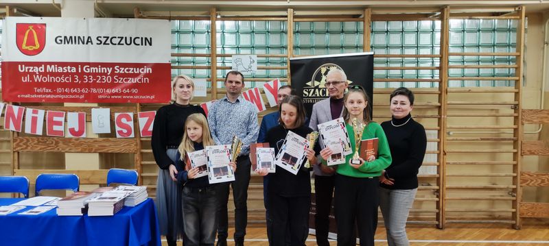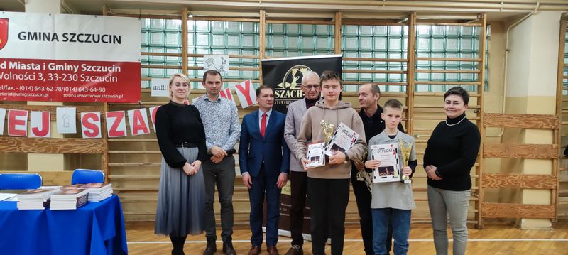 Zwycięzcom nagrody, pamiątkowe puchary i dyplomy wręczali: burmistrz Szczucina Jan Sipior, zastępca burmistrza Tomasz Bełzowski, prezes Stowarzyszenia „Szach-Mat” w Radomyślu Wielkim Ewelina Kopacz, dyrektor Szkoły Podstawowej Beata Dzięgiel oraz wicedyrektor Joanna Ryk.