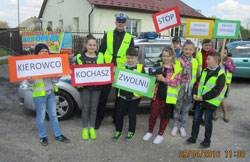 W tym dniu kierowcy poruszający się tą drogą byli zatrzymywani do kontroli przez nietypowe patrole. Funkcjonariuszy Referatu Ruchu Drogowego st. sierż. Marcina Chmurę i st. sierż. Adriana Wiatra podczas pełnienia służby wsparły dzieci Szkoły Podstawowej w Żelazówce.