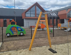 Na ukończeniu są również prace związane z zagospodarowanie terenu wokół budynku. Została wybudowana i przebudowana droga dojazdowa do budynku, wraz z miejscami postojowymi. Powstały 3 place zabaw dla dzieci, w tym 1 ogólnodostępny, oraz miasteczko ruchu drogowego i boisko wielofunkcyjne.