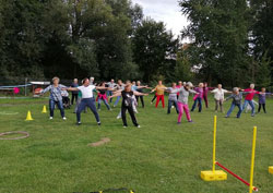 W pogodne wrześniowe popołudnie na stadionie MLKS „Dąbrovia” ponad 30-osobowa grupa członków dąbrowskiego UTW – po krótkiej rozgrzewce – rywalizowała w pięciu sportowych konkurencjach: bieg na 60m., zręcznościowy tor przeszkód, rzut do celu, hula-hoop i skakanka.