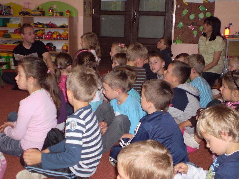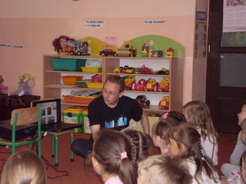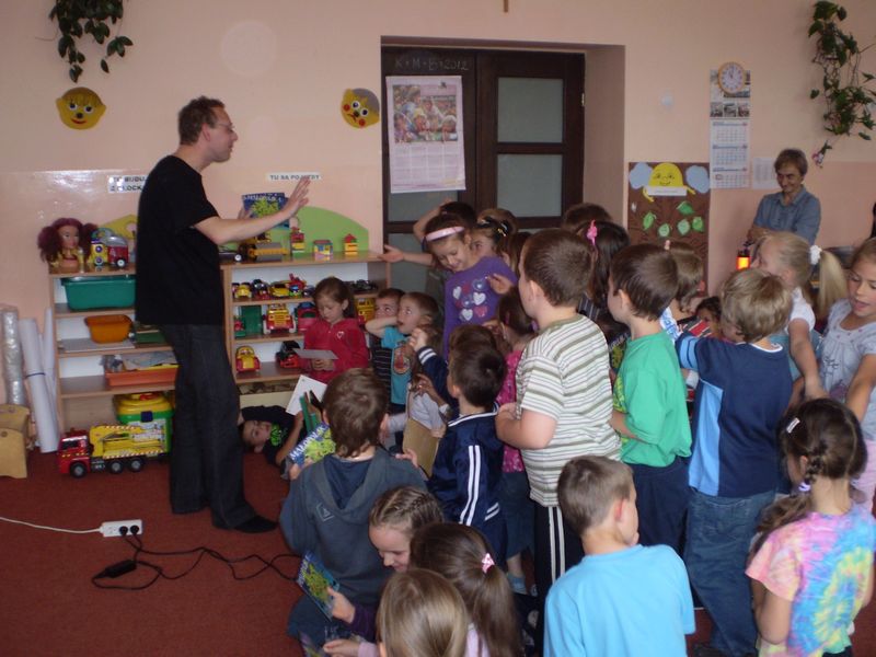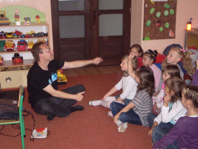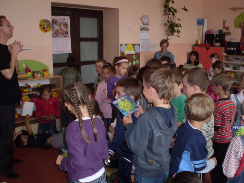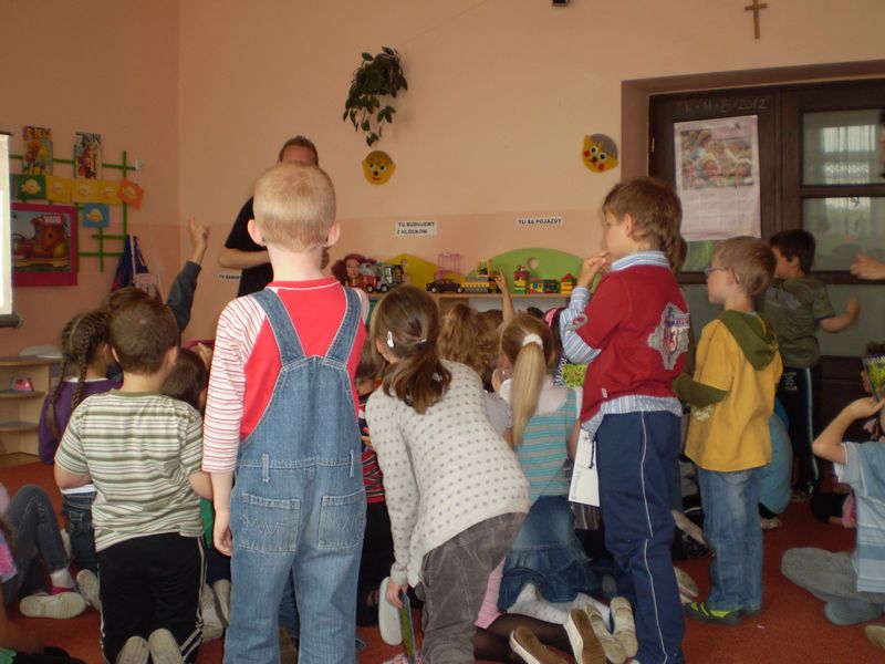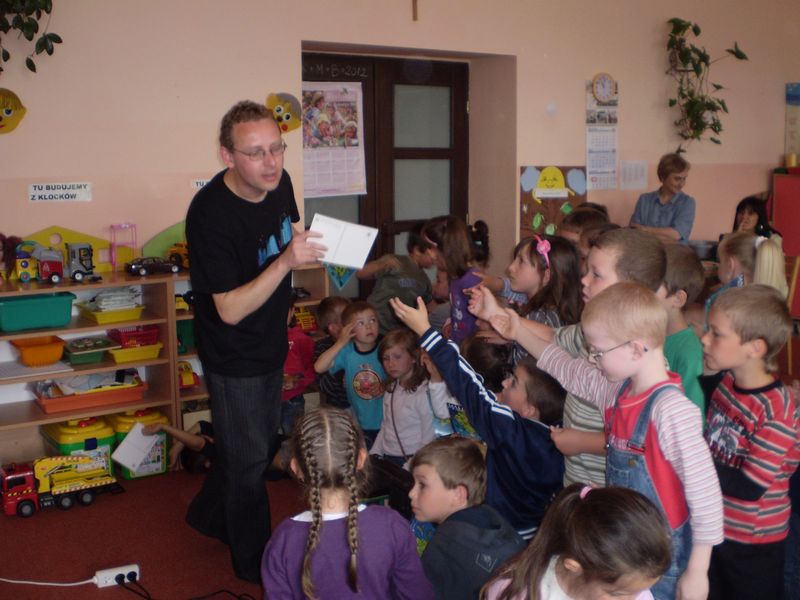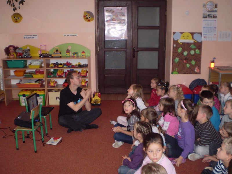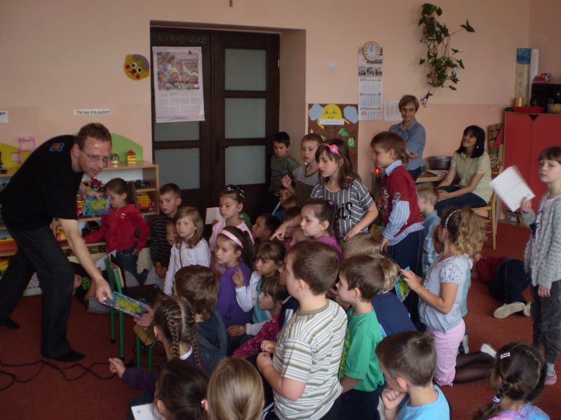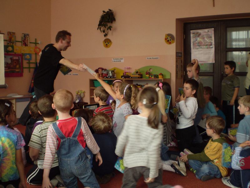 Po prezentacji dzieci odpowiadały na pytania dotyczące wędrówki Mirka Koralika. Za dobrą odpowiedź przedszkolaki otrzymały barwne widokówki z mapą Małopolski. Prowadzący zajęcia Szymon Bartosik pozostawił także w przedszkolu 20 bajek o Mirku Koraliku.