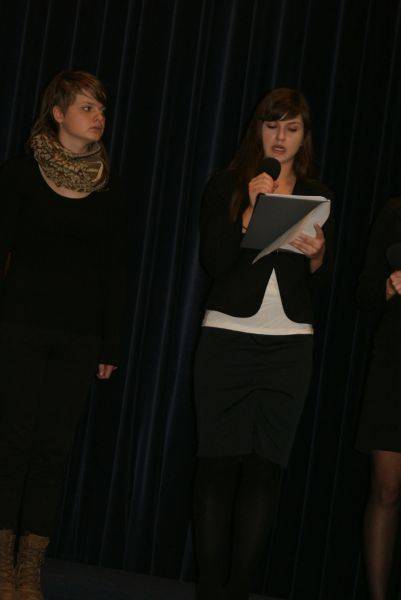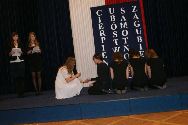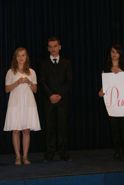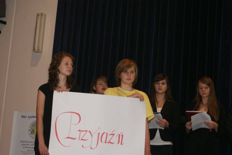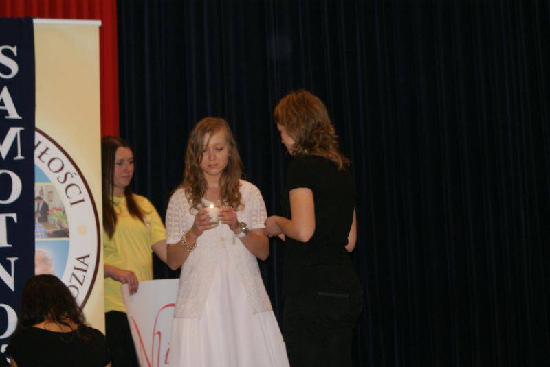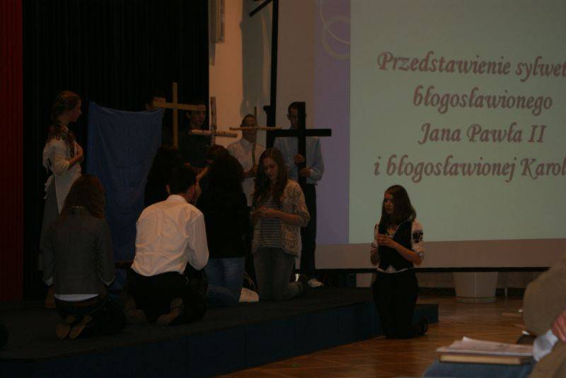 Uczniowie przedstawili prezentację multimedialną ukazującą całoroczną pracę wolontariuszy oraz krótką scenkę obrazującą nauczanie Jana Pawła II. Publiczność zachwycił też śpiew Ani Lis (II f).