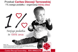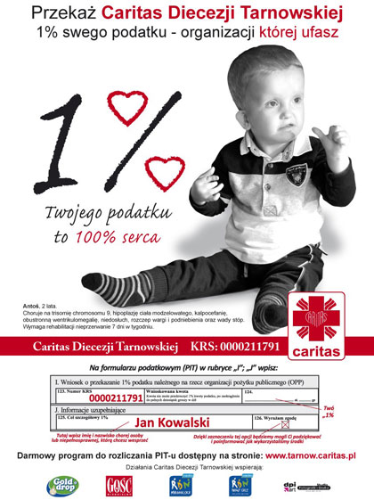 „1% Twojego podatku to 100% serca” – w taki sposób Caritas Diecezji Tarnowskiej zachęca, by przekazywać jej 1 proc. podatku. Na ulotkach i plakatach znajduje się zdjęcie jednego z podopiecznych Caritas – chorego dwuletniego Antosia, który wymaga rehabilitacji siedem dni w tygodniu.