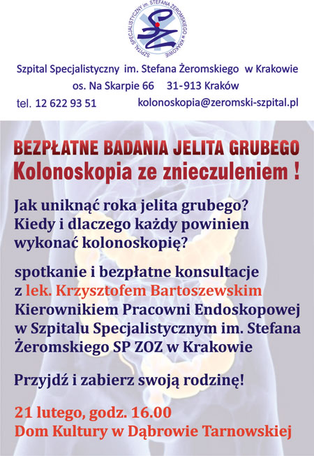 Bez kolejki, skierowania i w znieczuleniu. Mieszkańcy 8 powiatów Małopolski mogą zgłosić się na bezpłatne badanie w Szpitalu Specjalistycznym im. S. Żeromskiego w Krakowie. Dodatkowo refundowane są także koszty dojazdu i z powrotem. Rejestracja pod nr tel. 12 622 93 51 lub mailowo: kolonoskopia@zeromski-szpital.pl . Wszelkie informacje dostępne są na stronie: https://zeromski-szpital.pl/kolonoskopia/.