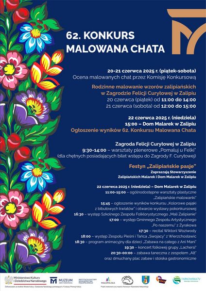 Finał 62. edycji Konkursu „Malowana Chata” odbędzie się w niedzielę 22 czerwca 2025 roku. Wydarzeniu towarzyszyć będą m.in. warsztaty plastyczne, festyn z zabawą taneczną oraz wiele atrakcji dla całych rodzin.
