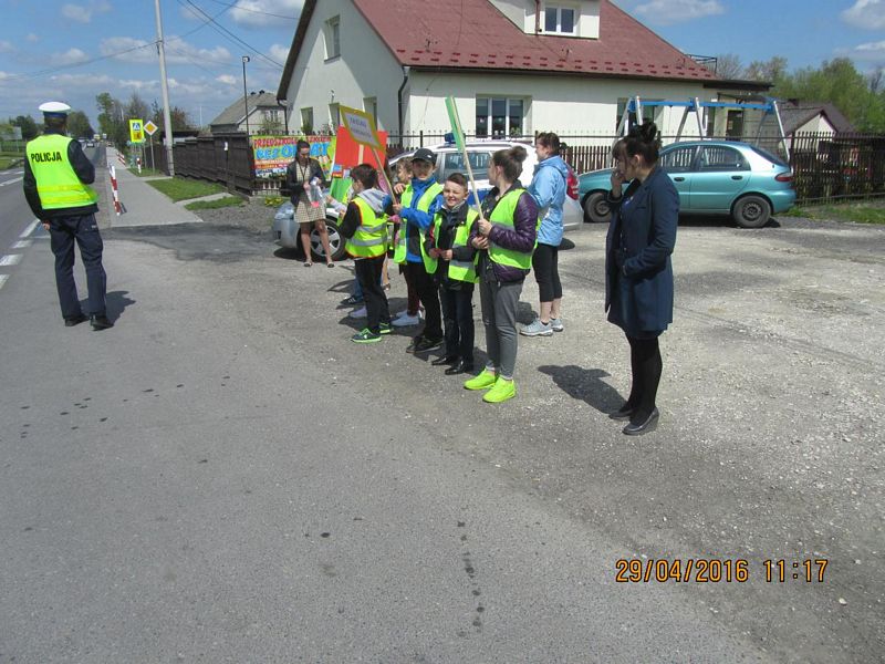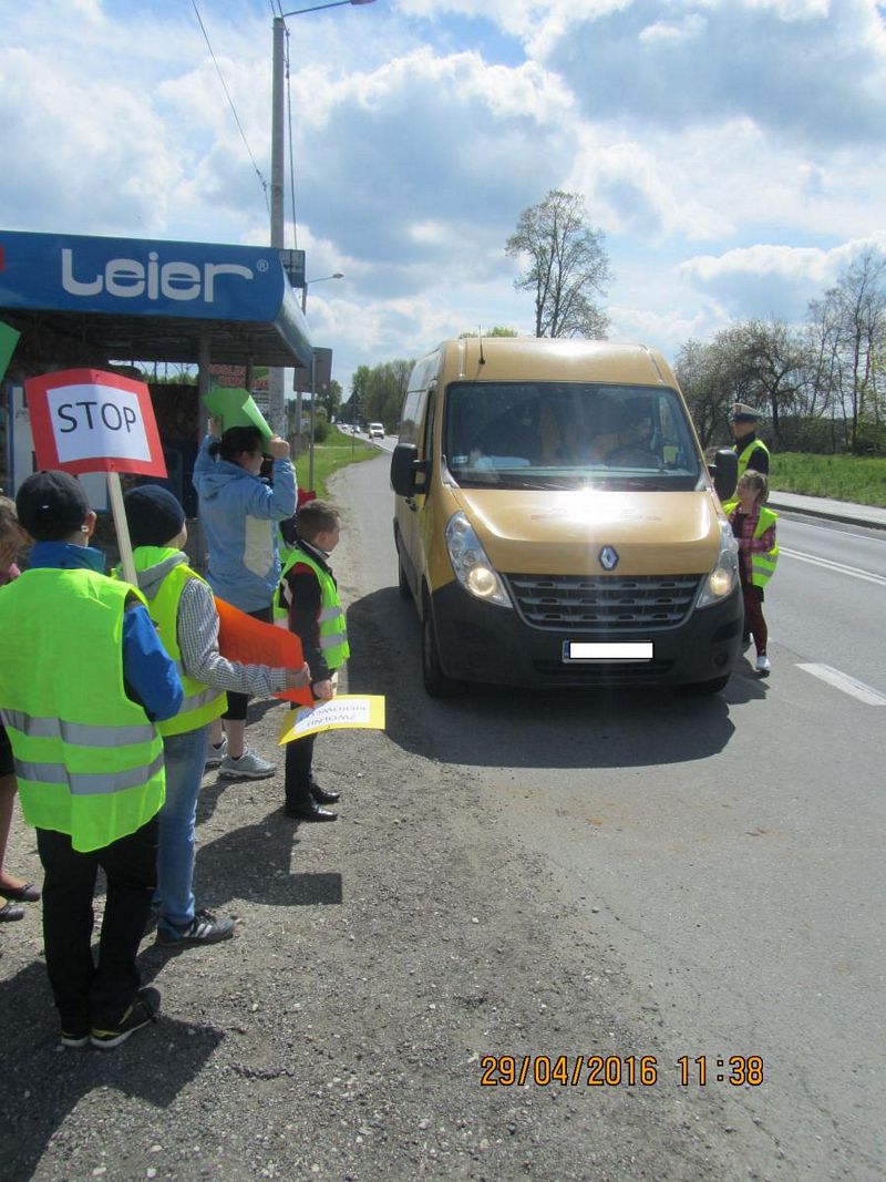W tym dniu kierowcy poruszający się tą drogą byli zatrzymywani do kontroli przez nietypowe patrole. Funkcjonariuszy Referatu Ruchu Drogowego st. sierż. Marcina Chmurę i st. sierż. Adriana Wiatra podczas pełnienia służby wsparły dzieci Szkoły Podstawowej w Żelazówce.
