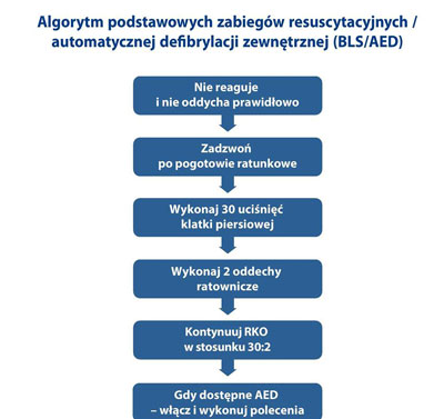 5. w przypadku zatrzymania krążenia natychmiast podjąć resuscytację krążeniowo- oddechową. ( najlepiej z użyciem AED – które może być dostępne w publicznych miejscach).