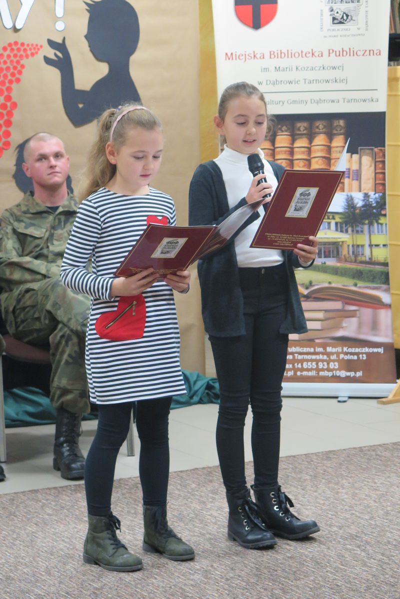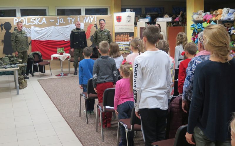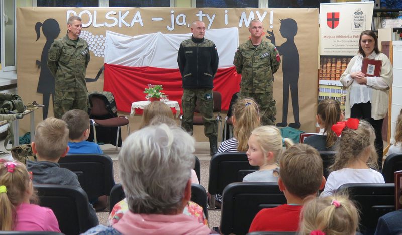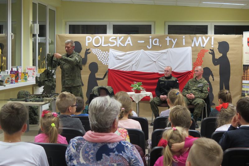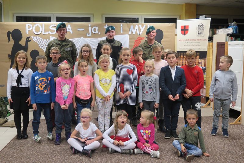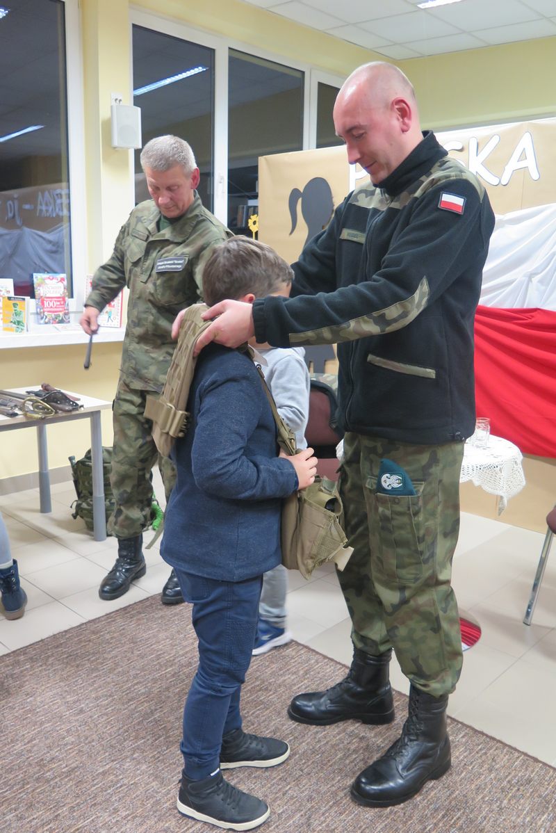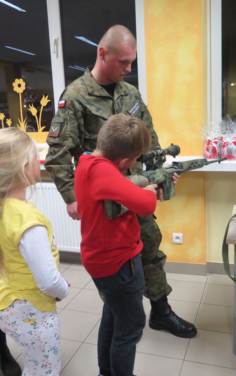 Ważnym elementem spotkania były także wspólne śpiewy patriotyczne oraz prezentacja wierszy o tej samej tematyce przez młodszych czytelników naszej Książnicy. Pod czujnym okiem strzelców, można było z bliska przyjrzeć się i przymierzyć broń oraz akcesoria niezbędne żołnierzom. Był także czas na wspólne rozmowy ze strzelcami, które zaspokoiły dziecięcą ciekawość.