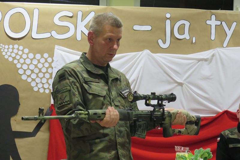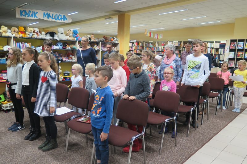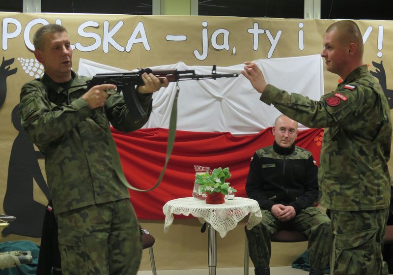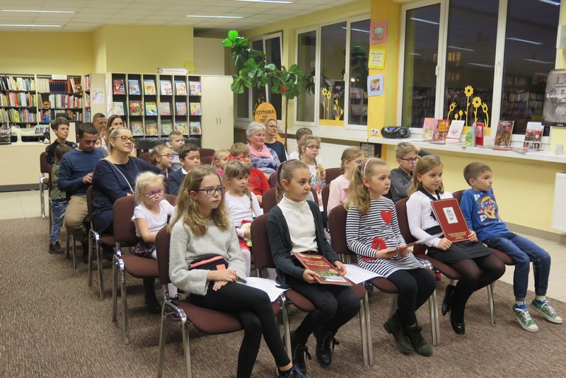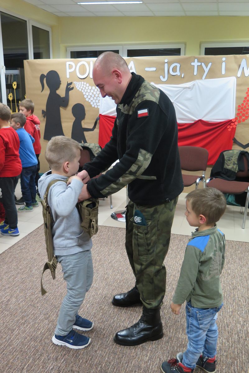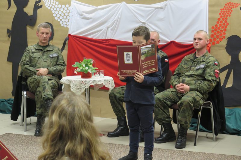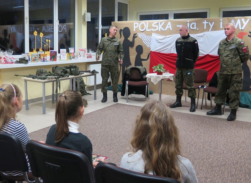 Ważnym elementem spotkania były także wspólne śpiewy patriotyczne oraz prezentacja wierszy o tej samej tematyce przez młodszych czytelników naszej Książnicy. Pod czujnym okiem strzelców, można było z bliska przyjrzeć się i przymierzyć broń oraz akcesoria niezbędne żołnierzom. Był także czas na wspólne rozmowy ze strzelcami, które zaspokoiły dziecięcą ciekawość.