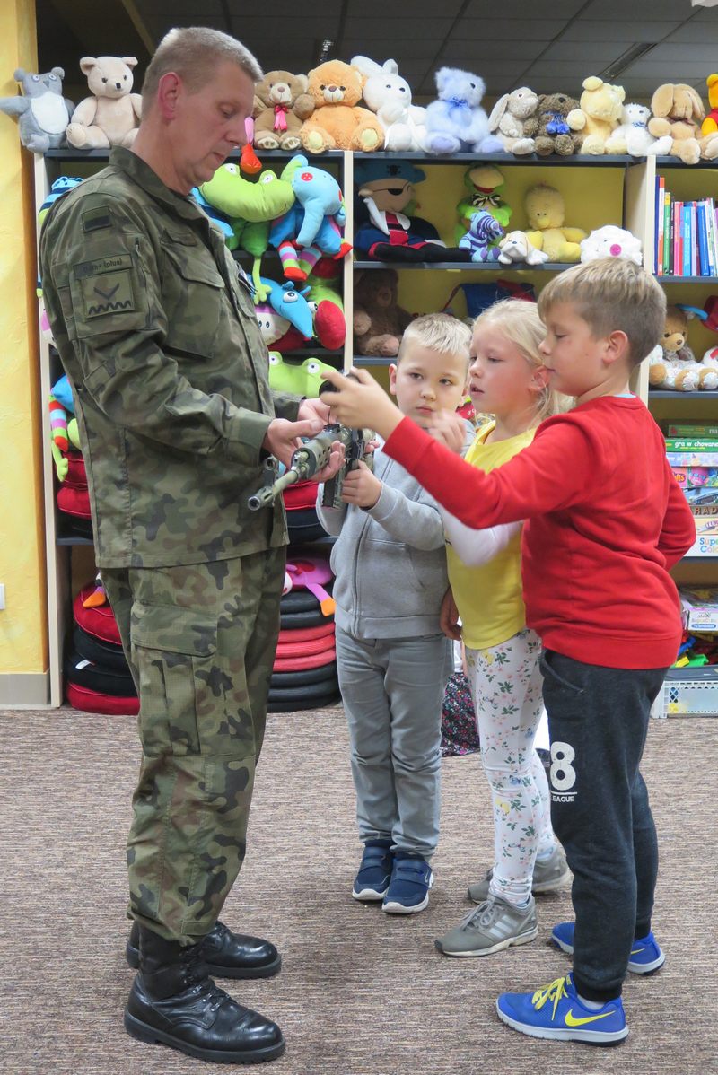 Miło spędzili czas młodsi i starsi goście Oddziału dla Dzieci MBP im. Marii Kozaczkowej w Dąbrowie Tarnowskiej w piątkowe popołudnie w otoczeniu broni białej, karabinów, hełmów i kamizelek kuloodpornych (ważących 10 kg!).