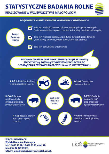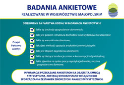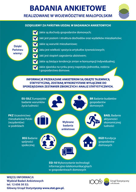 Urząd Statystyczny w Krakowie realizuje w gospodarstwach domowych oraz gospodarstwach rolnych na terenie województwa małopolskiego za pośrednictwem ankieterów statystycznych liczne badania prowadzone przez Główny Urząd Statystyczny.
