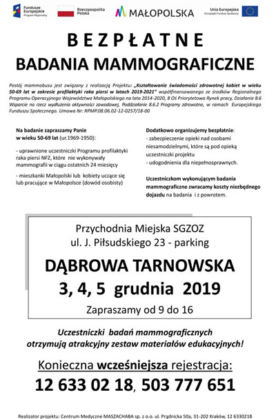 Na badania zapraszamy w Dąbrowie Tarnowskiej w dniach: 3-4-5 grudnia 2019 w godz. 09.00 do 16.00. Badania będą wykonywane w mammobusie ustawionym na parkingu Przychodni Miejskiej SGZOZ, ul. J. Piłsudskiego 23.