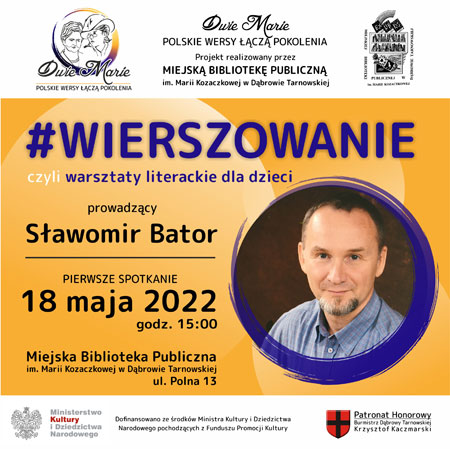 Miejska Biblioteka Publiczna im. Marii Kozaczkowej w Dąbrowie Tarnowskiej serdecznie zaprasza chętne dzieci (w wieku 7-12 lat) na pierwsze warsztaty organizowane w ramach realizacji projektu „Dwie Marie – polskie wersy łączą pokolenia”.