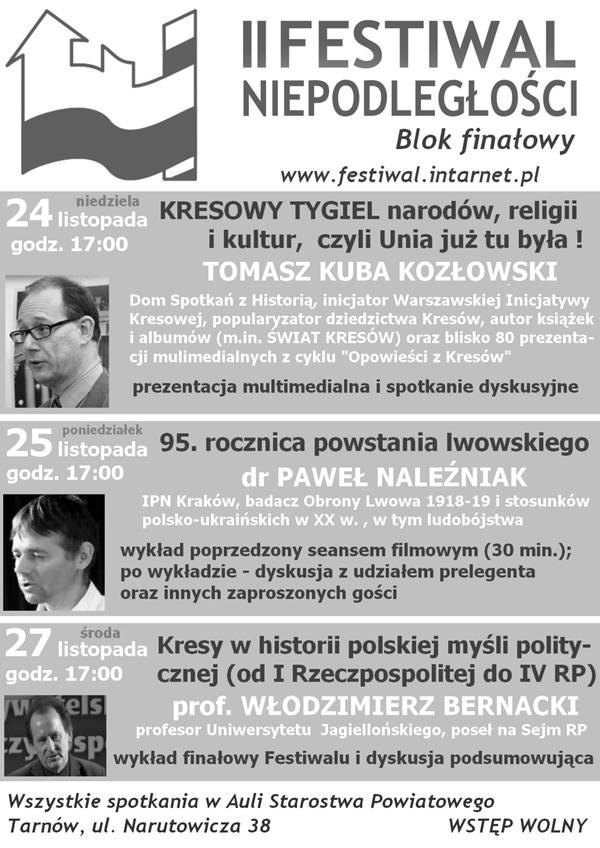 Blok finałowy II Festiwalu Niepodległości rozpocznie 24 listopada (niedziela) prezentacja multimedialna Tomasza Kuby Kozłowskiego z Domu Spotkań z Historią w Warszawie pt. „Kresowy tygiel narodów, religii i kultur, czyli Unia już tu była !” T.K. Kozłowski jest znanym popularyzatorem dziedzictwa Kresów, organizatorem Warszawskiej Inicjatywy Kresowej, autorem albumów i książek (m.in. monumentalnego „świata Kresów”) oraz blisko 80 prezentacji multimedialnych z cyklu „Opowieści z Kresów„.