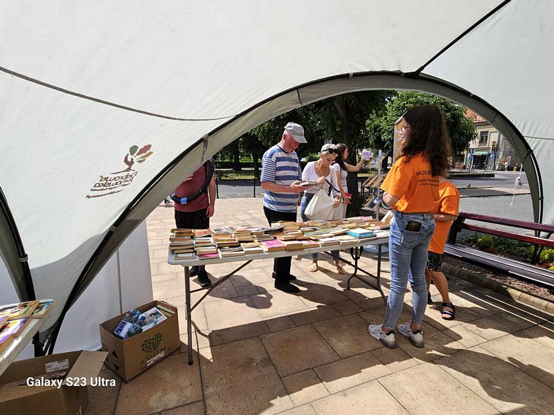 Pracownicy MBP świetnie zaaranżowali centralną ekspozycję książkową, gdzie za ekspozytor posłużył ukwiecony klomb w centrum skwerku przed urzędem miejskim. Książki były widoczne przez przechodniów, łatwo dostępne, a każdy z czytelników mógł się zatrzymać, pochylić nad wybraną pozycją i rozważyć, czy to właśnie tę lekturę zabierze ze sobą do domu. Oczywiście – jak w rankingu pisarzy mogących utrzymać się z pisania książek – największą popularnością cieszyły się bajki dla dzieci, które zostały uwolnione jako pierwsze. A były wśród nich takie perełki, jak książki dzieciństwa wielu pokoleń: „Serce” Zygmunta Amicisa, „Baśnie i legendy” Henryka Sienkiewicza, dawne wydanie „Bajek” Marii Konopnickiej.