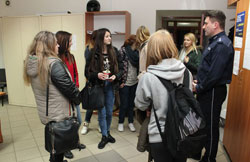 W czasie pobytu na terenie Komendy młodzież zapoznała się między innymi z pracą policjantów, szczególnie na stanowisku oficera dyżurnego, strukturą organizacyjną jednostki, pomieszczeniami jakimi dysponuje jednostka, charakterem pracy każdego z Wydziałów oraz wyposażeniem indywidualnym funkcjonariuszy Policji.
