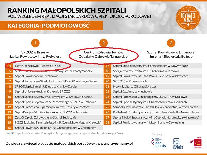 Ranking, który zwyciężył Szpital Powiatowy w Brzesku, przygotowało stowarzyszenie ,,Obywatel Mama’’. W związku z realizacją projektu „Mamy prawo” zrealizowało ono audyt społeczny blisko 30 oddziałów położniczych małopolskich szpitali. Działacze sprawdzali jakość i dostępność usług gwarantowanych w zakresie opieki okołoporodowej oraz inicjowanie działań na rzecz pozytywnych zmian. Stowarzyszenie diagnozowało, na ile poszczególne placówki stosują w praktyce respektowanie planów porodowych. Sprawdzano też dostęp i sposób udzielania informacji w trakcie, przed i po porodzie, a także poszanowanie pacjentek poprzez używanie odpowiednich słów, tonu wypowiedzi oraz gestów przez personel medyczny. W okresie od lipca do grudnia 2015 r. zbierano informacje od pań, które rodziły dzieci w Małopolsce po maju 2013 r. Ankiety wypełniały kobiety, które właśnie urodziły dziecko. Ponadto informacje pozyskiwano także poprzez ankietę online od pań, które urodziły dziecko wcześniej lub nie dotarły do nich audytorki stowarzyszenia.