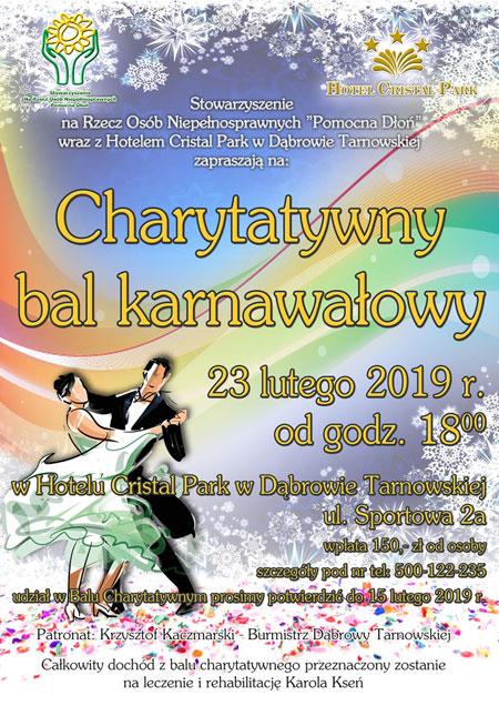 Stowarzyszenie Na Rzecz Osób Niepełnosprawnych ”Pomocna Dłoń” w Dąbrowie Tarnowskiej serdecznie zaprasza na Charytatywny Bal Karnawałowy pod Patronatem Burmistrza Dąbrowy Tarnowskiej Krzysztofa Kaczmarskiego.