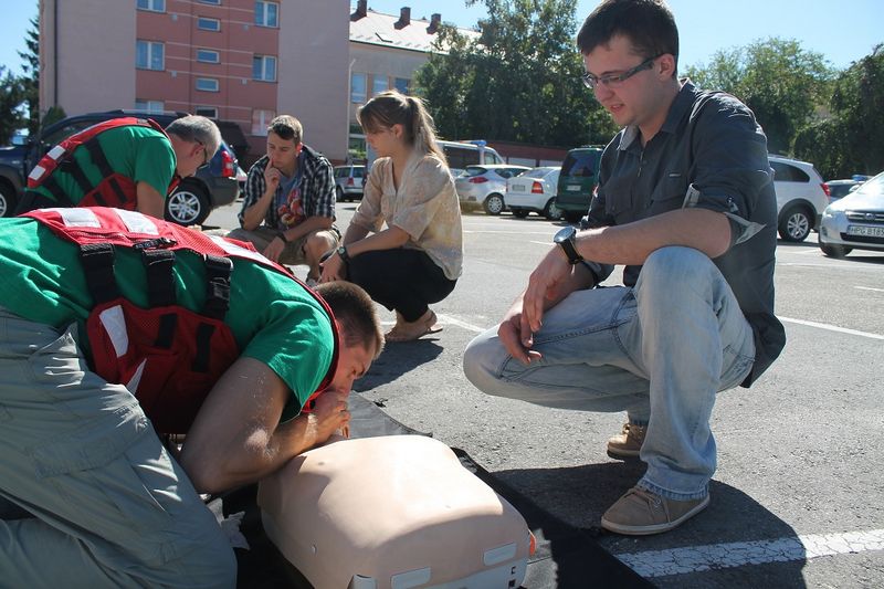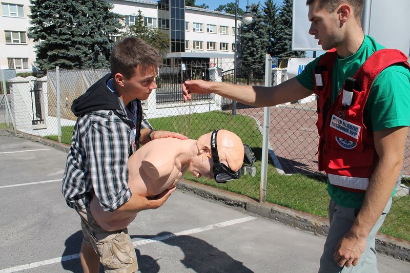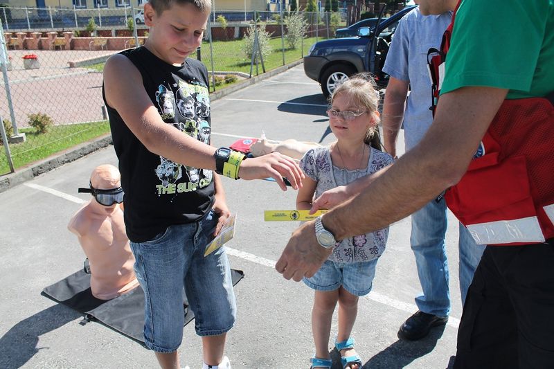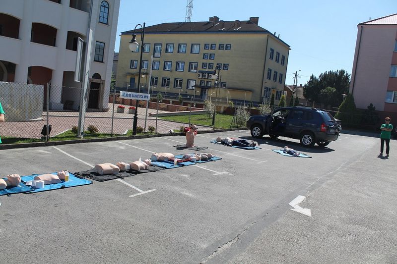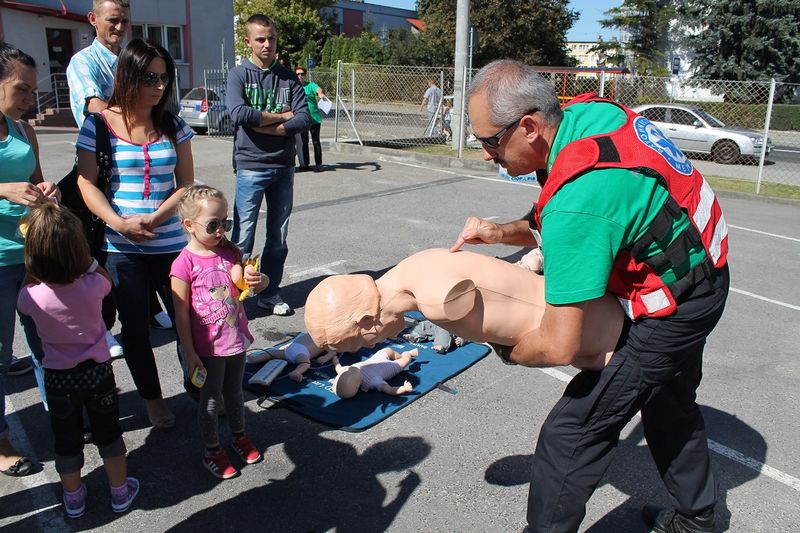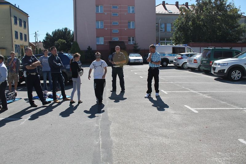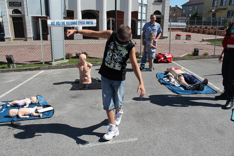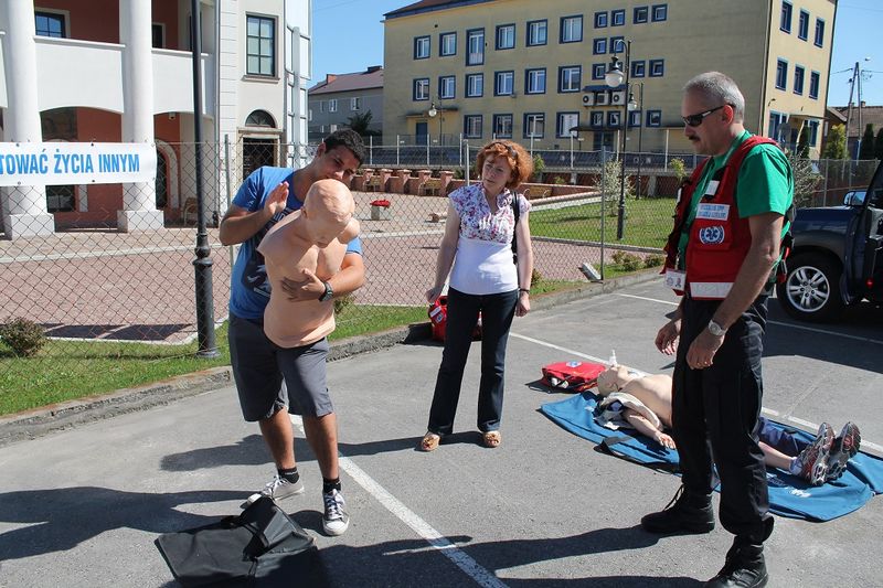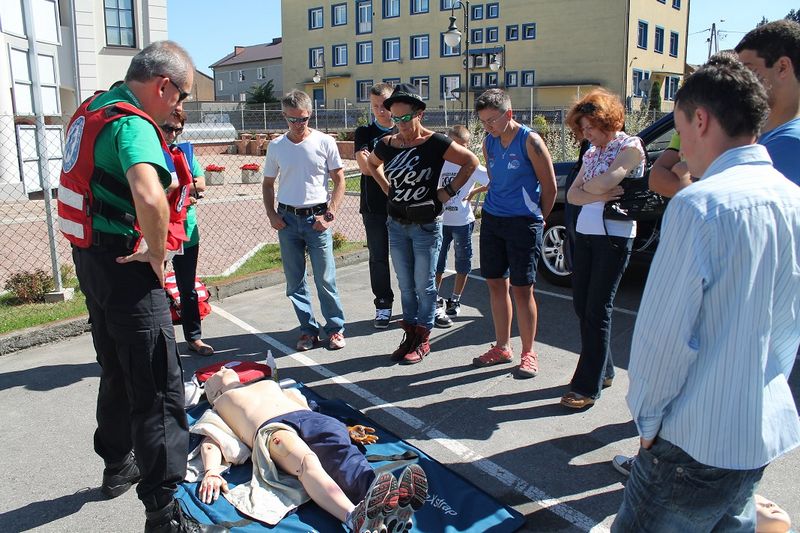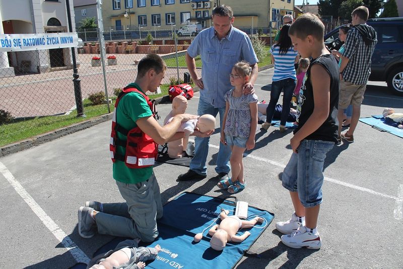 O godzinie 11-tej brama parkingu KPP została otwarta i plac był do dyspozycji tych, którzy chcieli skorzystać z nauki udzielania pierwszej pomocy. Instruktażu udzielali ratownicy kwalifikowanej pierwszej pomocy. Dorosły, dziecko, niemowlę, poszkodowany z licznymi ranami oraz ewakuacja z auta – na takich manekinach można było uczyć się i ćwiczyć.
