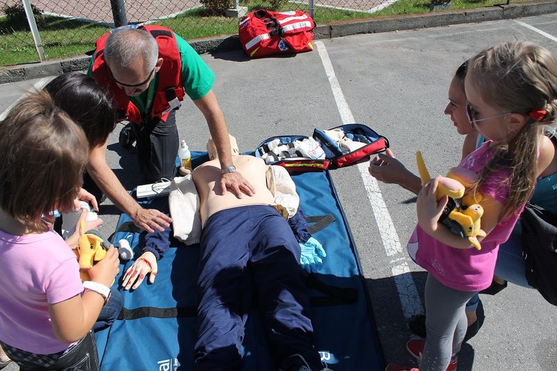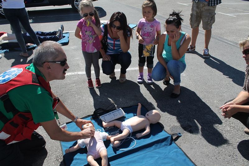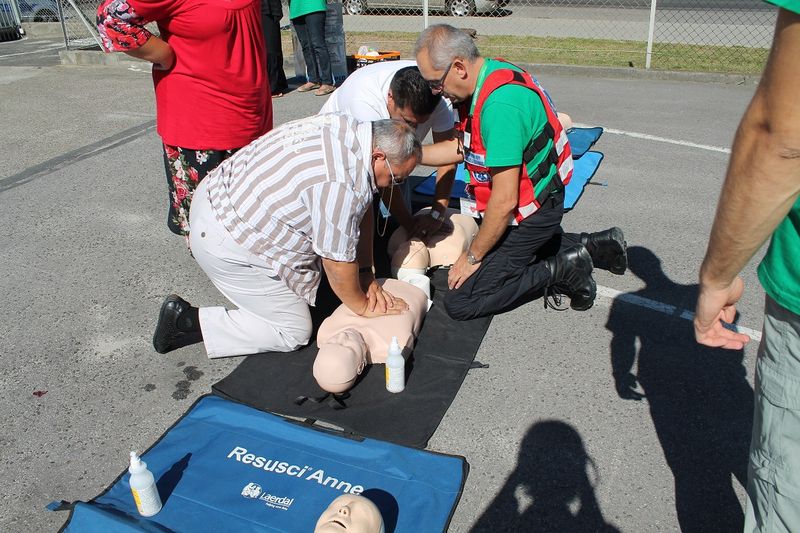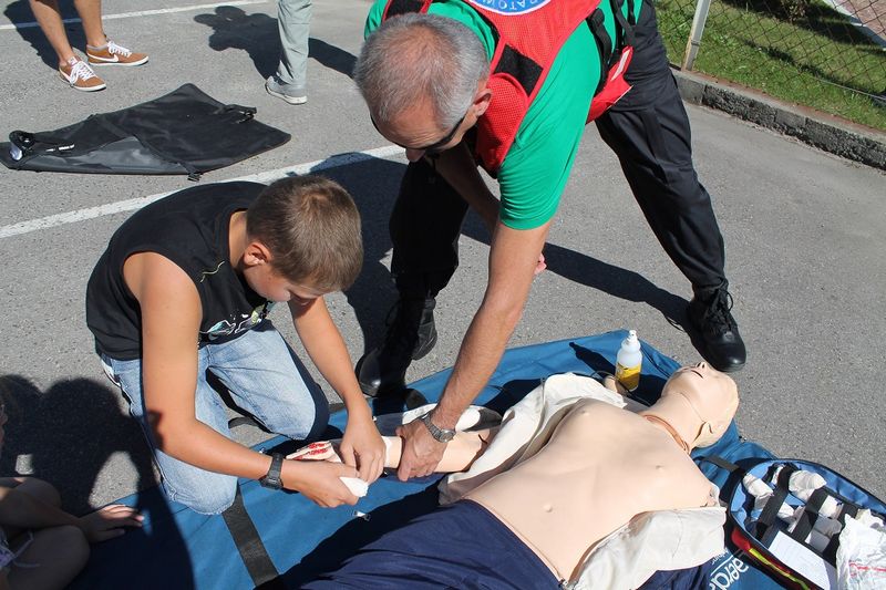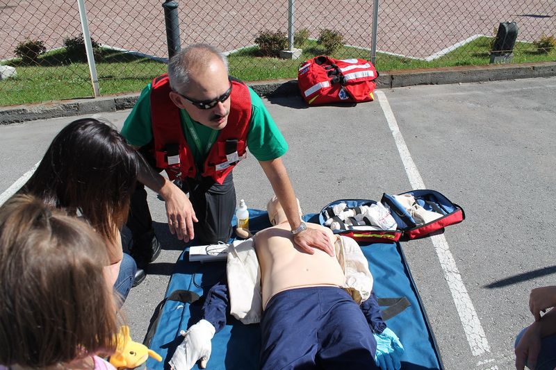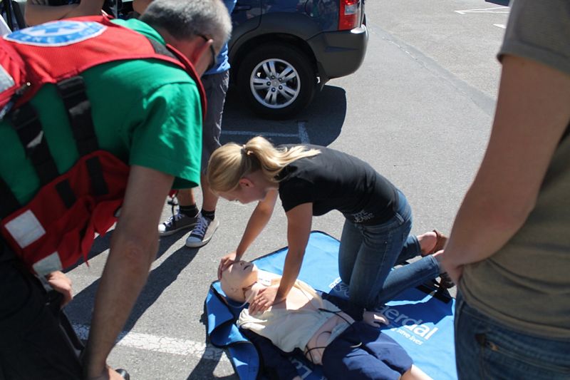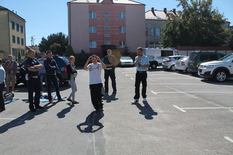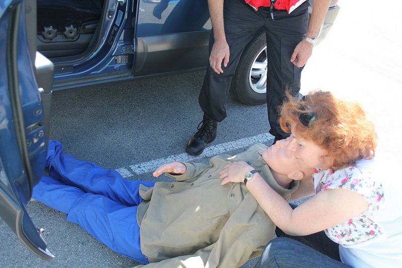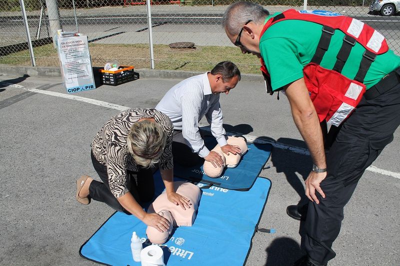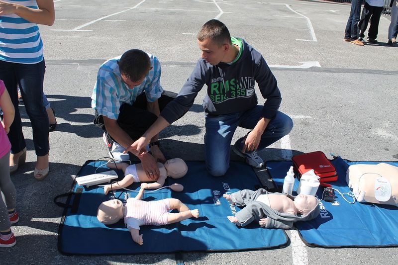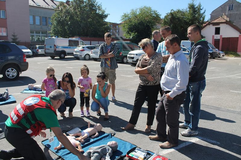 O godzinie 11-tej brama parkingu KPP została otwarta i plac był do dyspozycji tych, którzy chcieli skorzystać z nauki udzielania pierwszej pomocy. Instruktażu udzielali ratownicy kwalifikowanej pierwszej pomocy. Dorosły, dziecko, niemowlę, poszkodowany z licznymi ranami oraz ewakuacja z auta – na takich manekinach można było uczyć się i ćwiczyć.