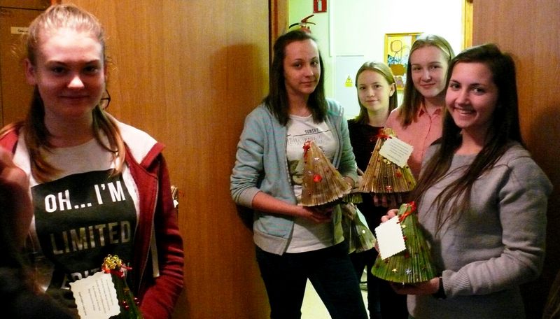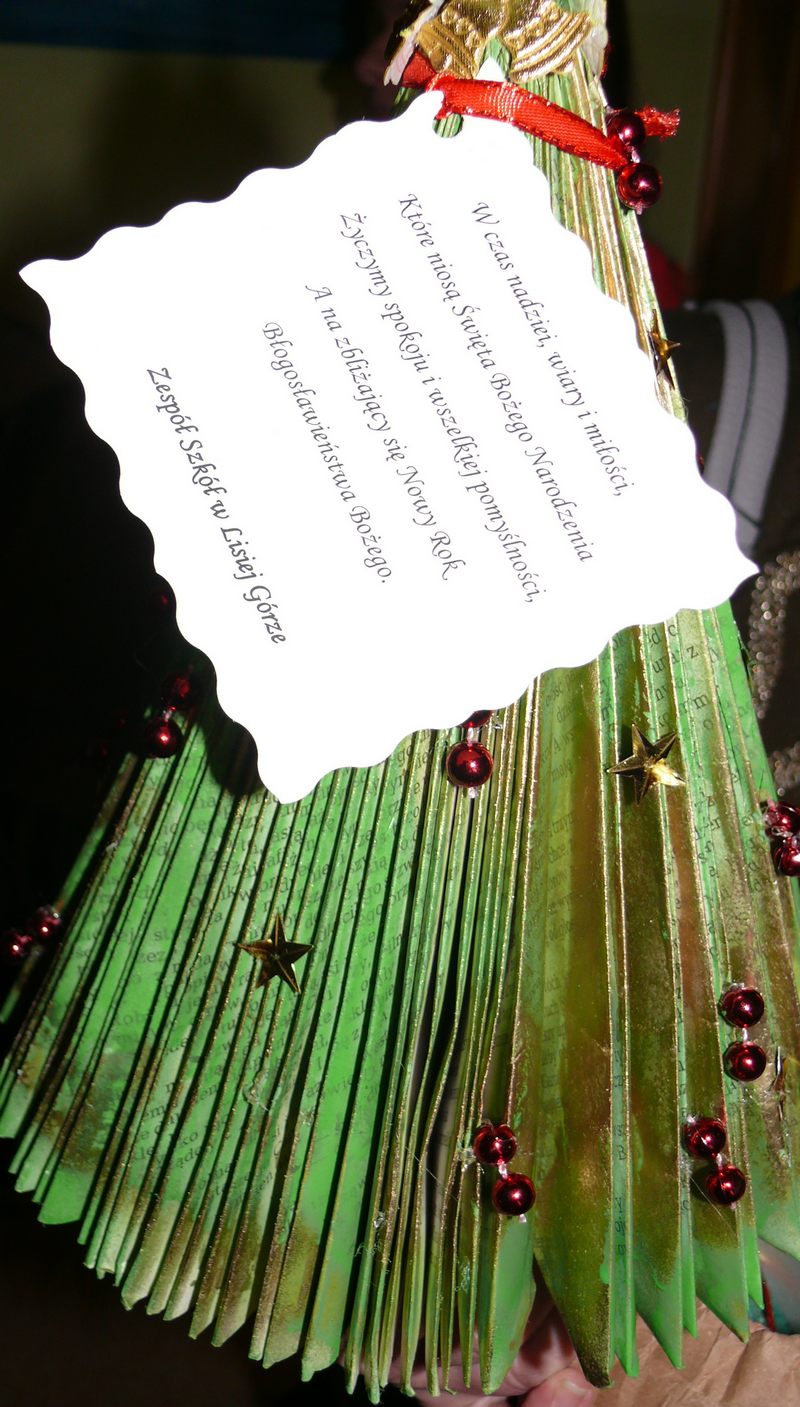 Wg pomysłu i pod nadzorem p. Justyny Golec od wielu dni wykonywano w gimnazjum im. Ofiar Katynia w Lisiej Górze niepowtarzalne choinki ze …starych książek. Każda w innym rozmiarze, inaczej ozdobiona i pokolorowana – łącznie ponad 50 sztuk.