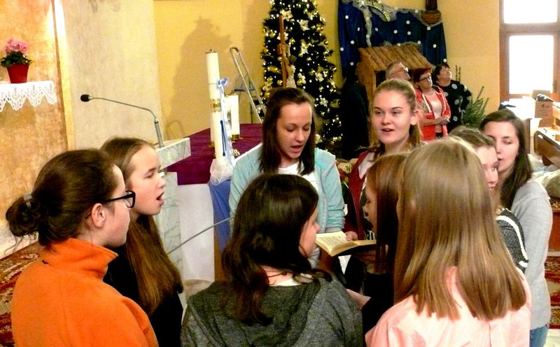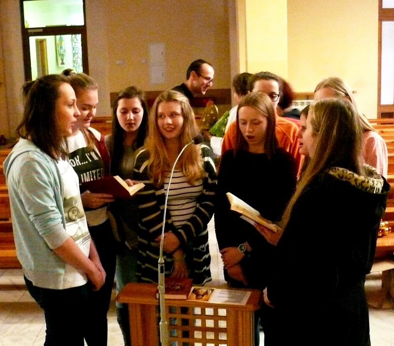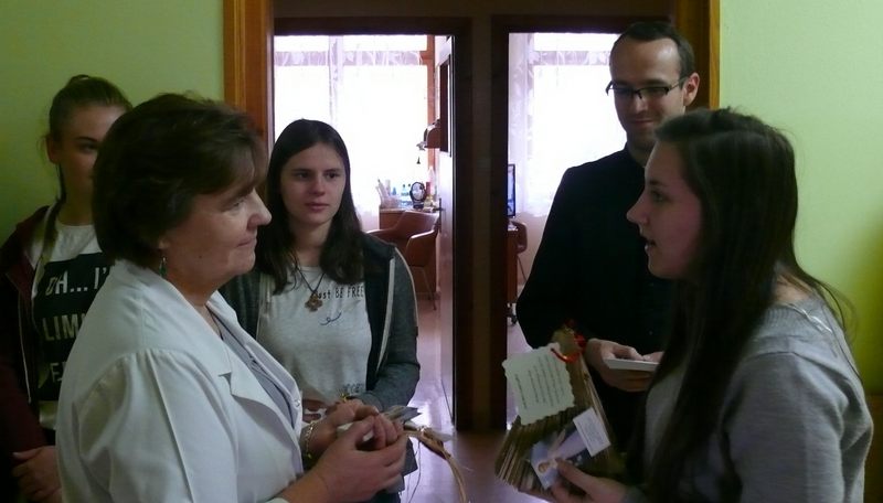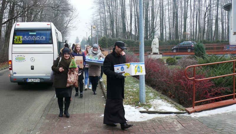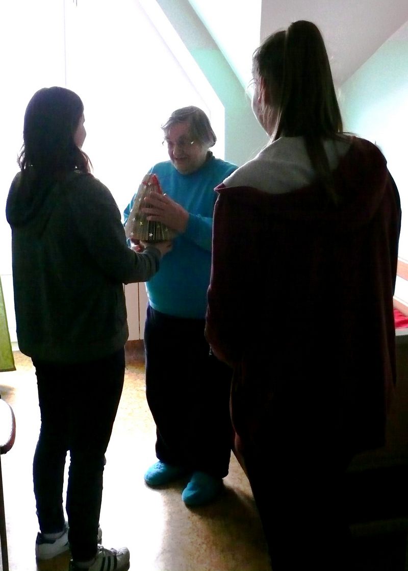 Te piękne prezenty przywieziono pensjonariuszom dąbrowskiego hospicjum wraz z życzeniami świątecznymi. Oprócz młodzieży z klasy III b i autorki pomysłu, w delegacji znalazła się p. pedagog Mariola Szatko oraz ks. Grzegorz Krakowski. Po rozdaniu choinek, w kaplicy odbył się mini koncert kolęd , a śpiew przybyłych dziewcząt dzięki radiowęzłowi dotarł do wszystkich mieszkańców.
