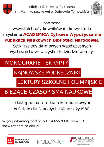 Miejska Biblioteka Publiczna w Dąbrowie Tarnowskiej zaprasza wszystkich użytkowników do korzystania z systemu ACADEMICA Cyfrowa Wypożyczalnia Publikacji Naukowych Biblioteki Narodowej.