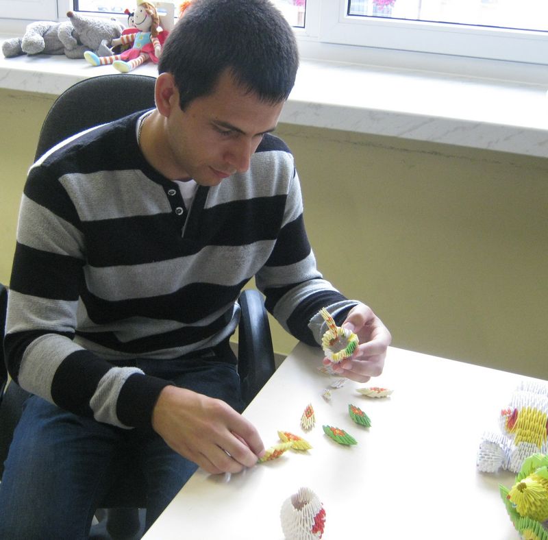 W fantastyczny świat składanych kartek papieru wprowadziła go znajoma ze studiów. Na początku swojej przygody z tą sztuką, wzory czerpał z Internetu, a z czasem doszedł do takiej wprawy, że obecnie do modelowania wystarcza mu tylko swoja, niczym nie ograniczona, wyobraźnia. Mimo to wciąż doskonali warsztat tejże techniki. I właśnie na wystawie „Czar poskładanych kartek” zaprezentowano wymyślone w znacznej części przez „mistrza karteczek” różnorodne modele. Są m.in. łabędzie różnej wielkości, samochody wyścigowe, lecący na nartach Adam Małysz, bałwanki, koszyczki z kurczątkami… Jak sam mówi: Według mnie najważniejszymi pracami w tym zakresie była kopia Kościoła Najświętszej Maryi Panny Szkaplerznej w Dąbrowie Tarnowskiej (ponad 20 tysięcy elementów) oraz statek piracki (ponad 11 tysięcy elementów).