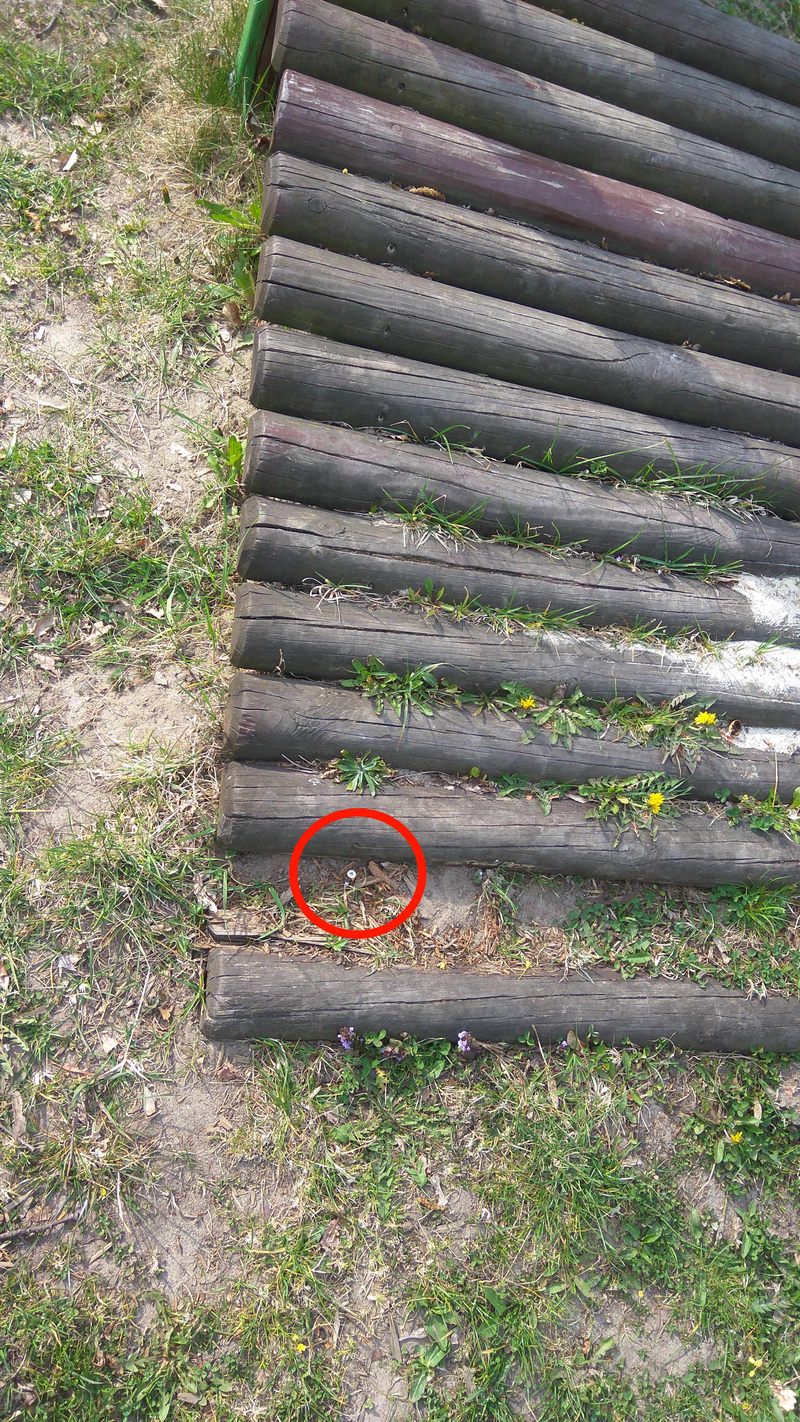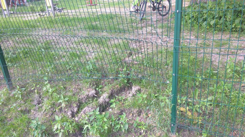 5) zdj. 8 – ogrodzenie – nowo powstałe na jesieni ogrodzenie panelowe już jest w 2 miejscach uszkodzone. Stare ogrodzenie po drugiej stronie obok „boiska” też zniszczone (chyba przy wycince drzew), zardzewiała siatka, która stwarza jeszcze większe niebezpieczeństwo. Czy ogrodzony plac zabaw nie powinien zapewnić bezpieczeństwa dzieciom?