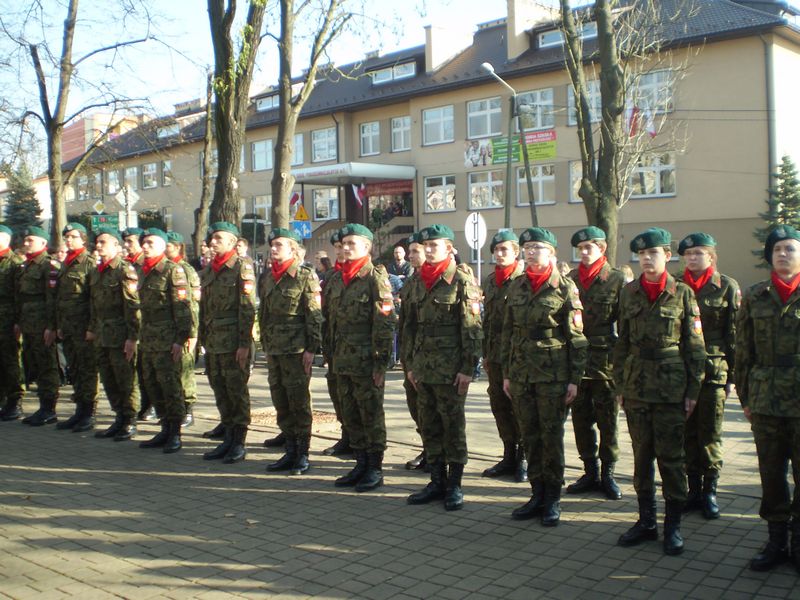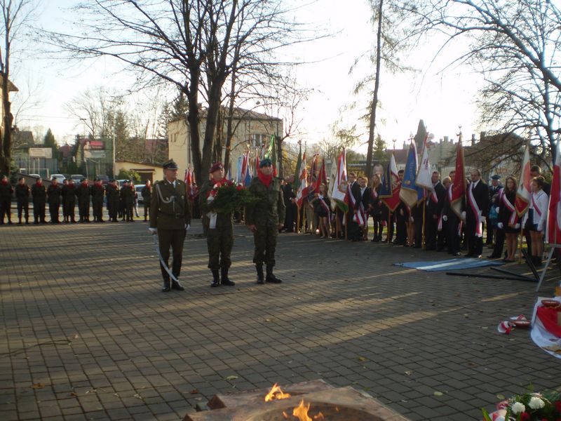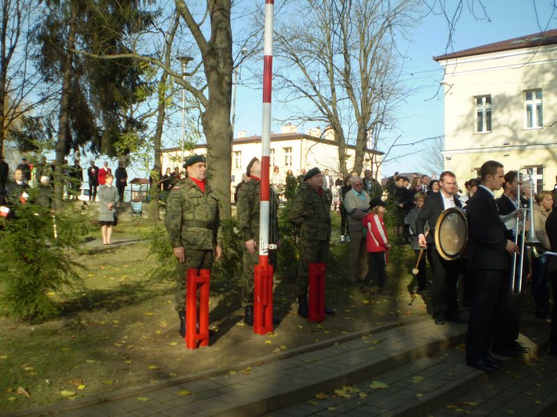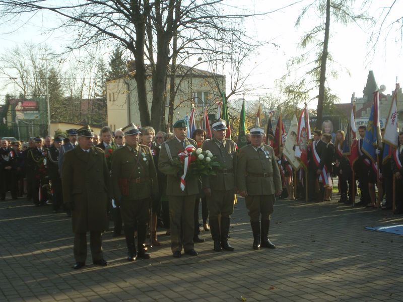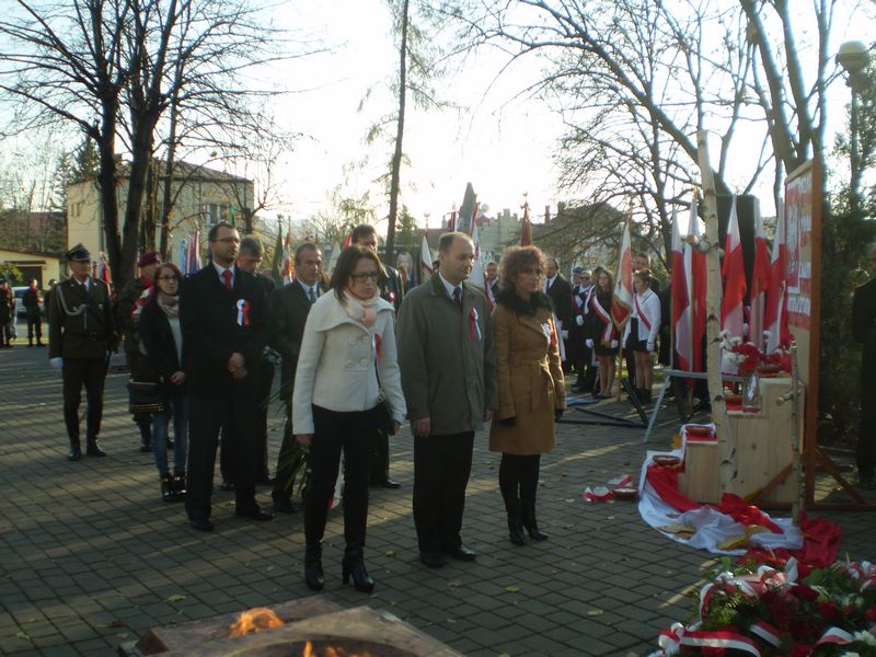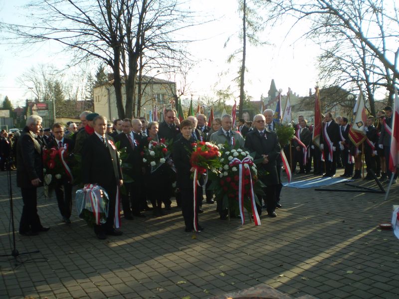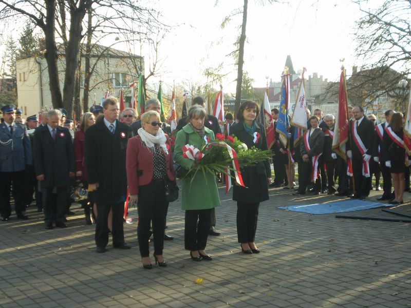 Burmistrz powitał krótko przybyłych pod pomnik uczestników Święta Niepodległości. Byli wśród nich m.in., oprócz mieszkańców, którzy tego roku dopisali, przedstawiciele instytucji i organizacji, parlamentarzyści, Członek Zarządu Województwa Małopolskiego Stanisław Sorys, przewodniczący: rady miasta i powiatu, kombatanci oraz poczty sztandarowe.