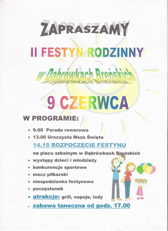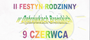Zaproszenie na II Festyn Rodzinny w Dąbrówkach Breńskich, niedziela 9 czerwca 2013 roku. Rozpoczęcie o godz. 14:15 na placu szkolnym.