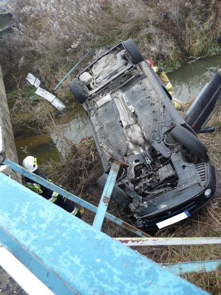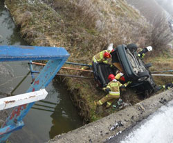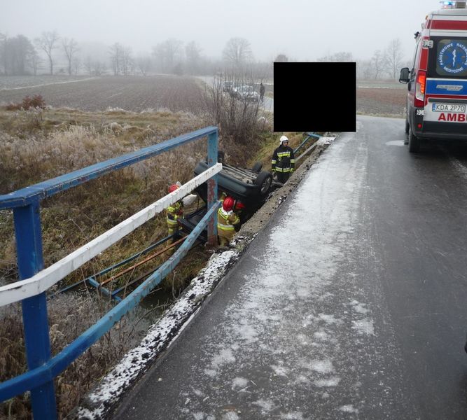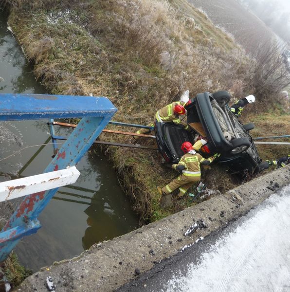 Jak informuje PSP w Dąbrowie Tarnowskiej, w samochodzie były 3 osoby – dwie dorosłe i dziecko. Prawdopodobnie w wyniku poślizgu kierowca uderzył w bariery energochłonne, wypadł z mostu i dachował na międzywale, na terenie zielonym blisko rzeki Żabnica.