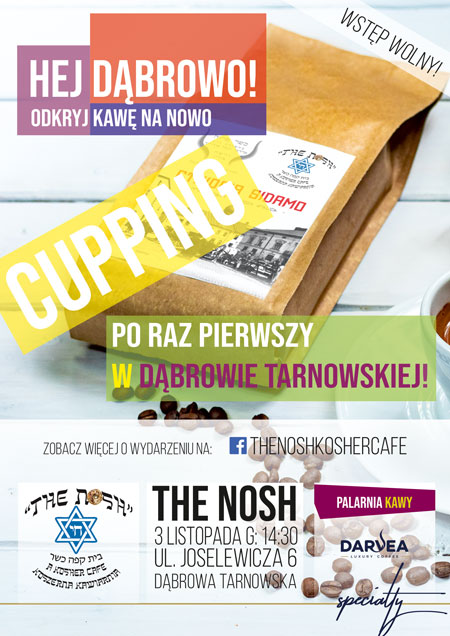 W niedzielne popołudnie 3 listopada (od 14:30), właściciel koszernej kawiarni „The Nosh”, usytuowanej w podziemiach dąbrowskiej synagogi zaprasza serdecznie na „Cupping” – degustację wspaniałej kawy pod hasłem: „Hej Dąbrowo, odkryj kawę na nowo!”
