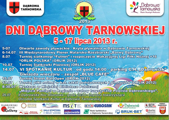 Jak co roku Urząd Miejski w Dąbrowie Tarnowskiej wraz z Dąbrowskim Domem Kultury i Centrum Handlowym „Dąbrowiak” zapraszają na święto miasta, na Dni Dąbrowy. Już dzisiaj zapraszamy na tegoroczne Święto Dąbrowy Tarnowskiej, które odbędzie się w dniach 5 – 17 lipca br.