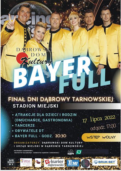 Finał Dni Dąbrowy odbędzie się w niedzielę 17.07 na stadionie miejskim MLKS „Dąbrovia”. Już od godz.14:00 będzie można korzystać z licznych atrakcji dla dzieci i rodzin (dmuchańce, gastronomia). Od godz. 17:00 organizatorzy: Dąbrowski Dom Kultury i Urząd Miejski w Dąbrowie Tarnowskiej zaplanowali koncert z udziałem dziecięcych i młodzieżowych zespołów tańca nowoczesnego, młodych wokalistów związanych ze sceną DDK. Około godz.19:00 wystąpi lokalny zespół „Obywatele DT” promujący swoją debiutancką płytę. Na godz.20:30 przewidziano koncert gwiazdy wieczoru – grupy „Bayer Full”, obchodzącej w tym roku 40-lecie pracy scenicznej (disco polo).