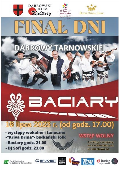 Finał święta miasta odbędzie się w niedzielę 16 lipca na parkingu obok Hotelu Cristal Park i terenie przyległym wraz z ul. Sportową (zamknięte dla ruchu kołowego od godz.10:00 będą trzy drogi, oprócz Sportowej: Zielona i Różana). W godz. popołudniowych (od 17:00) wystąpią tancerki z „Dance Art Studia Tańca” i wokaliści, z którymi w roku szkolnym pracuje Monika Kuta (prezentacja talentów związanych z DDK). W dalszej kolejności będzie można posłuchać bałkańskiej muzyki folkowej („Kriva Drina”). Około godz.21:00 zaplanowano koncert „Baciarów”, a o 23:00 po raz pierwszy w historii kilkunastu lat Dni Dąbrowy organizatorzy przewidzieli zabawę „pod chmurką” z DJ Sofi. Impreza zakończy się po północy. Wstęp jest wolny.