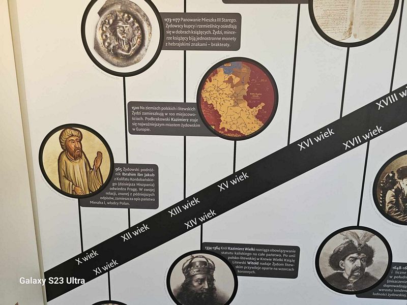 Na ścianach pawilonu zamieszczono informacje o wybitnych Żydach – obywatelach Polski (niektórzy z nich, jak np. znakomici poeci, np. Bolesław Leśmian, identyfikowali się wręcz jako Polacy), cytaty (w tym wypowiedzi osób, które za sprawą styczności z wystawą Muzeum na Kółkach zmienili myślenie o kulturze żydowskie lub stało się to przyczynkiem do odkrycia ich korzeni), chronologiczną oś czasu z ważnymi dla Żydów datami (i konsekwentnie – również dla Polaków, bo zwłaszcza Polska przedwojenna była wielokulturowa i na terenie RP współistniało ze sobą przyjaźnie wiele narodów i kultur).