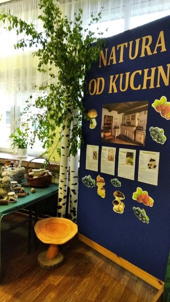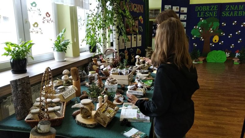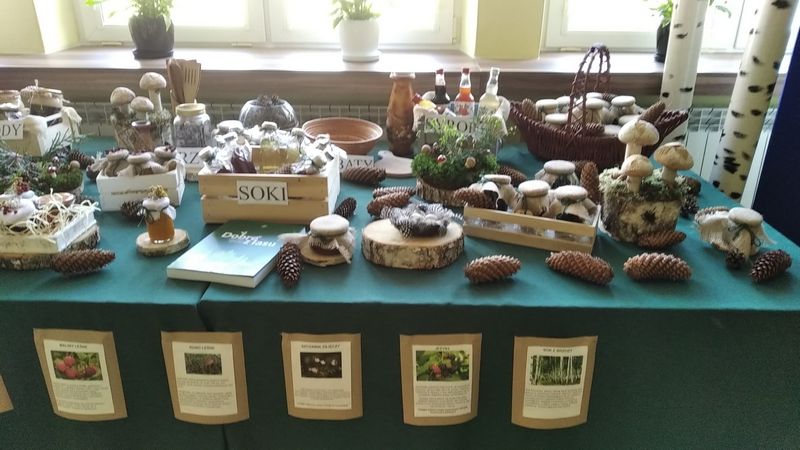 Na szkolnym holu zostało przygotowane stoisko popularyzujące produkty runa leśnego i nie tylko. Można było zobaczyć oryginalne dekoracje leśne, poczytać przepisów bazujących na produktach leśnych oraz zabrać ze sobą ulotkę z przepisem na pyszną zupę grzybową.