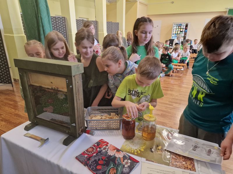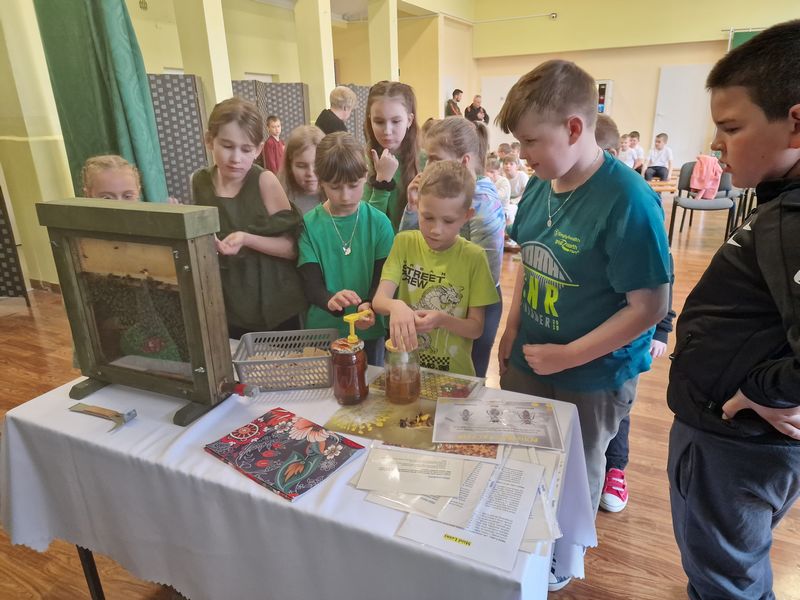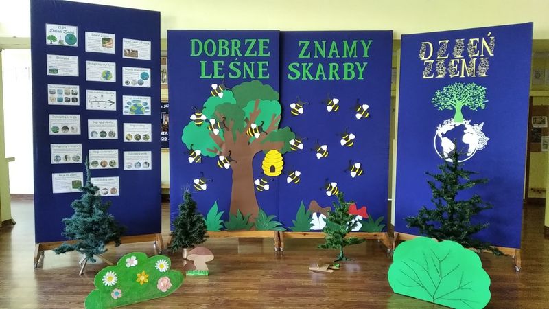 Realizacja projektu „Dobrze znamy leśne skarby” zbiegła się z obchodami w Szkole Podstawowej w Smęgorzowie Światowego Dnia Ziemi. 25 kwietnia zrobiło się w naszej szkole bardzo zielono, a to dzięki dekoracjom leśnym oraz uczniom, którzy tego dnia przyszli do szkoły ubrani na zielono. Pierwszym punktem rozpoczynającym Dzień Ziemi była pogadanka dla dzieci na temat prozdrowotnych walorów żywności pochodzenia leśnego. Również każdy uczeń i rodzic mógł sobie na ten temat poczytać z karteczek przypiętych do ekspozycji Natura od kuchni. Nauczyciel przyrody przypomniał również uczniom zasady właściwego zachowania się w lesie oraz zwrócił uwagę na szacunek dla pracy leśnika. Następnie uczniowie klasy pierwszej zaprezentowali się nam w przedstawieniu ekologicznym zatytułowanym „Przygody w Stumilowym lesie”. Tematyka przedstawienia dotyczyła lasu i nawiązywała do prelekcji nauczyciela przyrody. Zwierzęta, które pojawiały się na scenie opowiadały o korzyściach jakie mamy z lasu, jak należy się w nim zachowywać, a przede wszystkim, że nie wolno w nim śmiecić. Kolejnym punktem dla uczniów klas I – III były warsztaty, które poprowadził zaprzyjaźniony ze stowarzyszeniem właściciel pasieki. Pszczelarz opowiadał dzieciom o zdrowotnym działaniu miodu leśnego oraz roli leśnych pszczół w przyrodzie. Uczniowie mogli też zobaczyć żywe pszczoły i dowiedzieć się wiele o ich życiu. Na zakończenie spotkania odbyła się obowiązkowo degustacja miodu leśnego. Ostatnim wydarzeniem dla najmłodszych w ramach Dnia Ziemi były warsztaty plastyczne połączone z konkursem dla dzieci, na najsympatyczniejszą leśną pszczółkę.