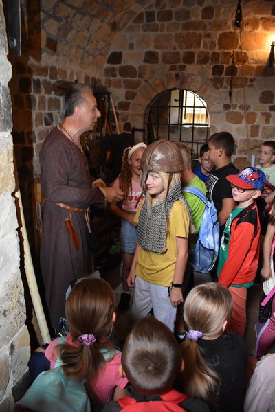 Podczas warsztatów poświęconych „Kulturze materialnej i duchowej średniowiecza” dzieci miały możliwość nie tylko poznać ciekawostki z historii wieków średnich, ale i dotknąć tej historii – replik uzbrojenia, ubioru, narzędzi wykorzystywanych w życiu codziennym.